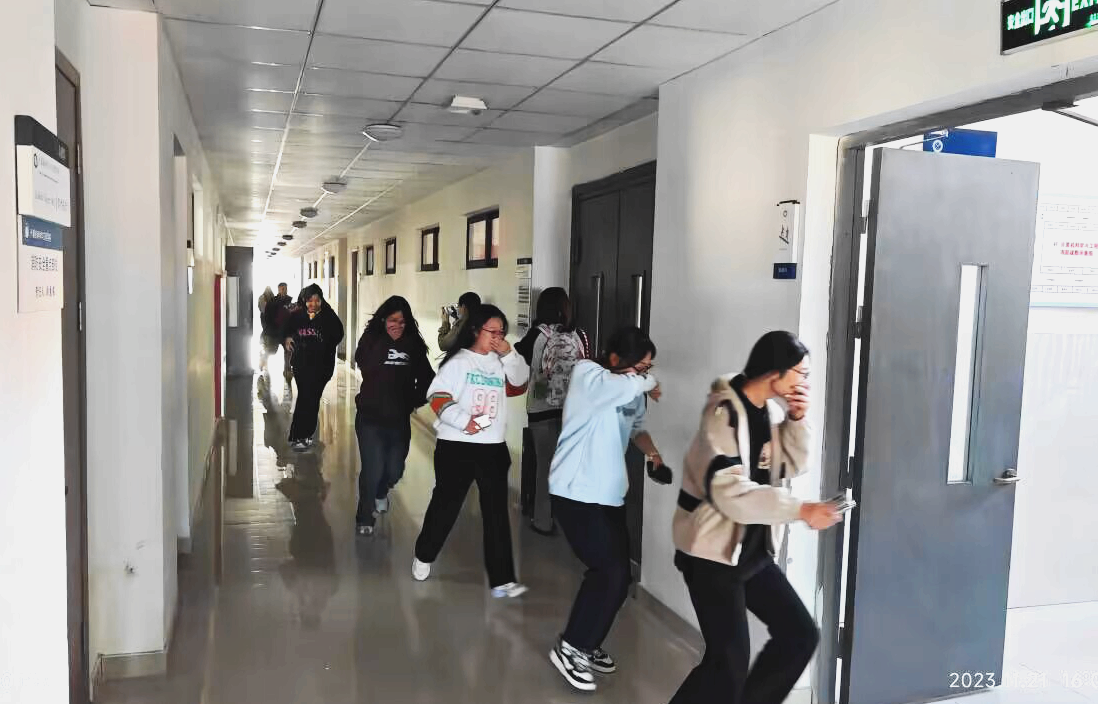 随着警报声响起,任课教师立刻停止授课,组织学生安全疏散,教室前后门的两位学生立即把门打开,楼层疏导员指挥学生捂住口鼻,低势行进。本着“安全快速、就近撤离”的原则,各班学生快速、有序地按既定疏散路线到达指定地点集合,所有学生均在5分钟内有序撤离了大楼,整个演习过程气氛紧张却井然有序,达到了预期的效果。