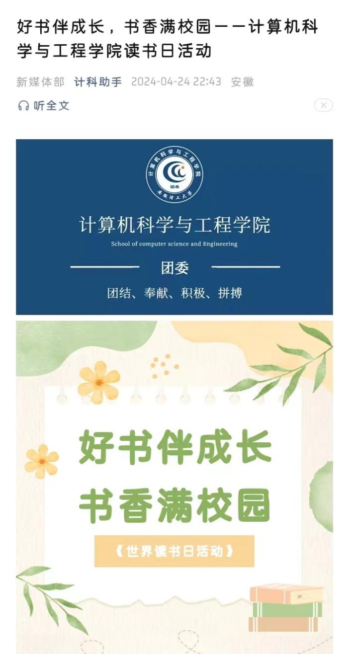 4月份,学院充分借助线上、线下多种宣传渠道,围绕“好书伴成长,书香满校园”这一主题,开展读书月系列宣传活动。利用学院“计科助手”微信公众号开展生动有趣的形式吸引学生参与互动、分享心得,积极传播读书月的相关信息,不断提升读书月活动的影响力和感染力。同时,线下组织开展图书爱心捐赠活动,倡导广大同学们积极捐赠分享自己的闲置书籍,为贫困山区的儿童奉献爱心。